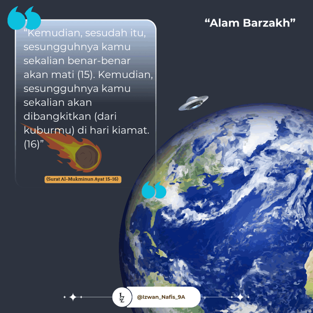 Desain ini membahas tentang Alam Barzakh dengan kutipan dari Al-Qur’an Surat Al-Mukminun ayat 15–16. Ayat tersebut mengingatkan bahwa setiap manusia pasti akan mati, lalu kelak dibangkitkan kembali pada hari kiamat. Visualnya menampilkan bumi, meteor, dan elemen luar angkasa sebagai simbol bahwa kiamat adalah peristiwa besar yang mengguncang alam semesta.
